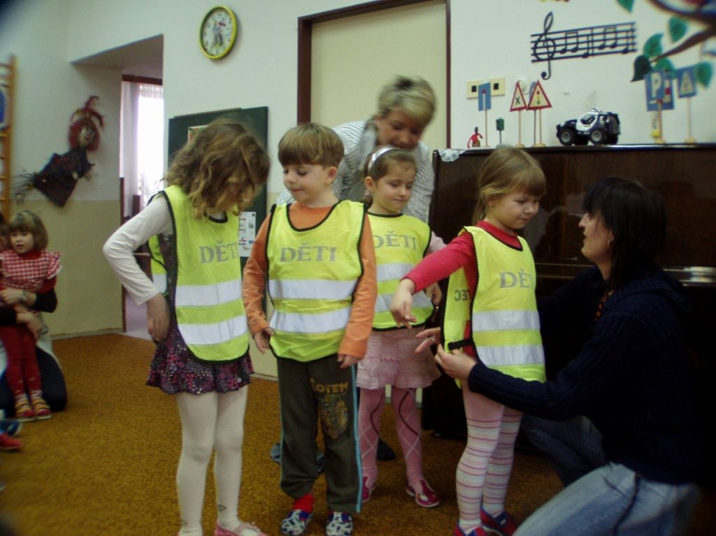 Děti se formou hry a ukázek učí dopravní situaci. Jak správně přecházet vozovku, barvy na semaforu a značky. Děti si vyzkoušejí hru na auta a správné přecházení. Běhají a chodí po třídě. Vysvětluje se i význam reflexních vestiček v dopravě, hlavně při jejich procházkách.